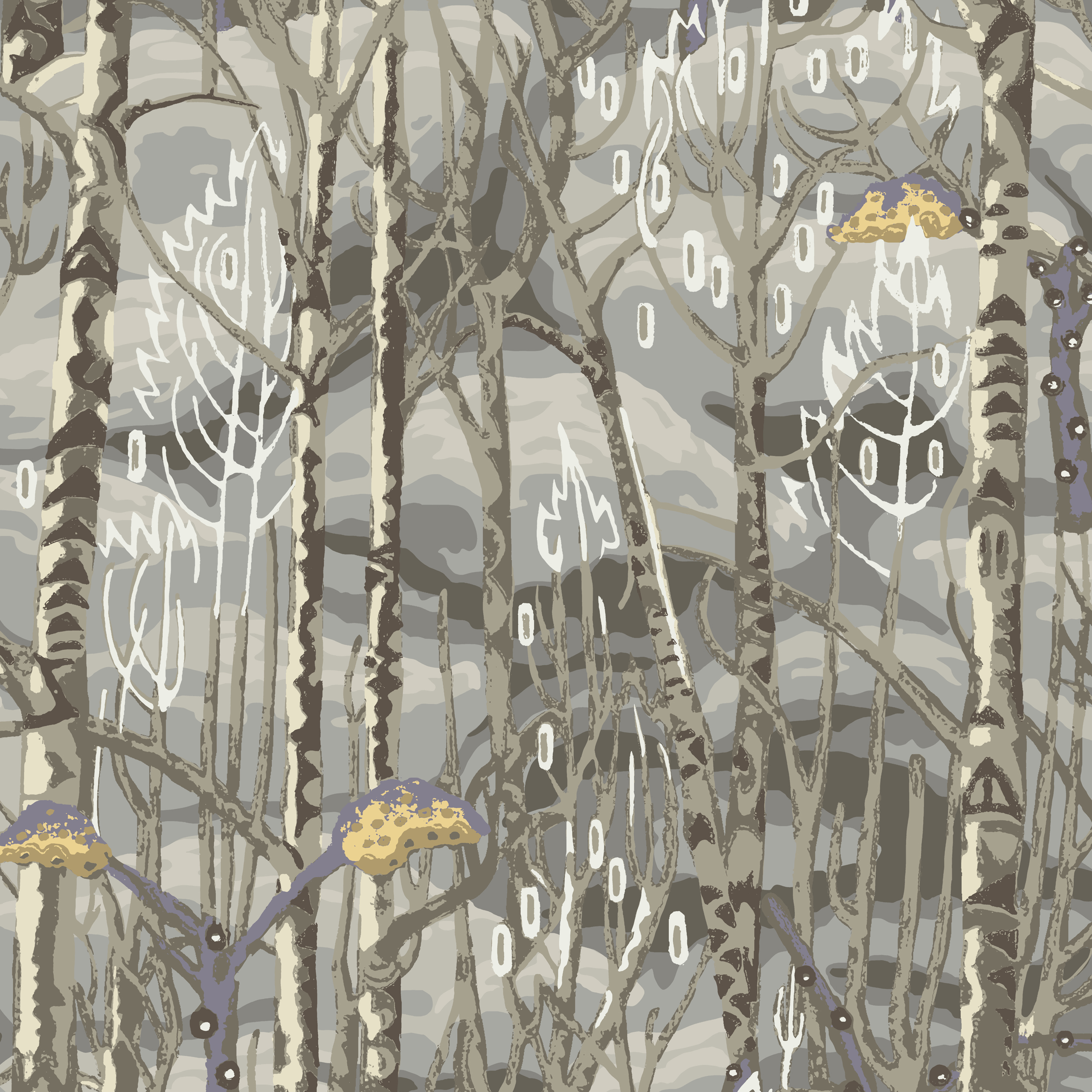 The Birches is Charles E. Burchfield’s first wallpaper design, created in 1921 shortly after he relocated to Buffalo to work as an assistant designer at the M. H. Birge & Sons Company. Borrowing imagery from his earlier watercolor Bluebird and Cottonwoods (1917), the pattern weaves young birch trees with spring catkins, sturdy cottonwoods, and arching sumac branches into a lively woodland composition.